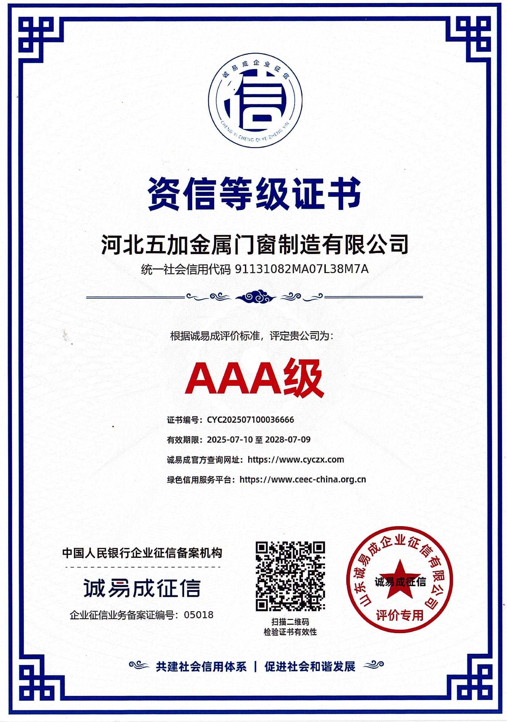 资信AAA等级证书